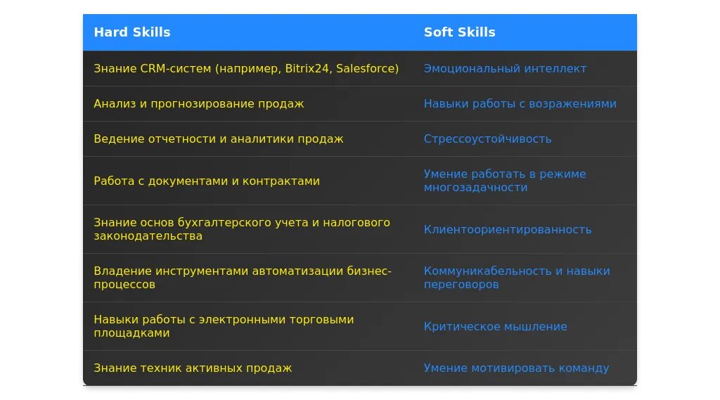 - Ключевые профессиональные навыки (например, работа с клиентами, CRM-системы, продажи).