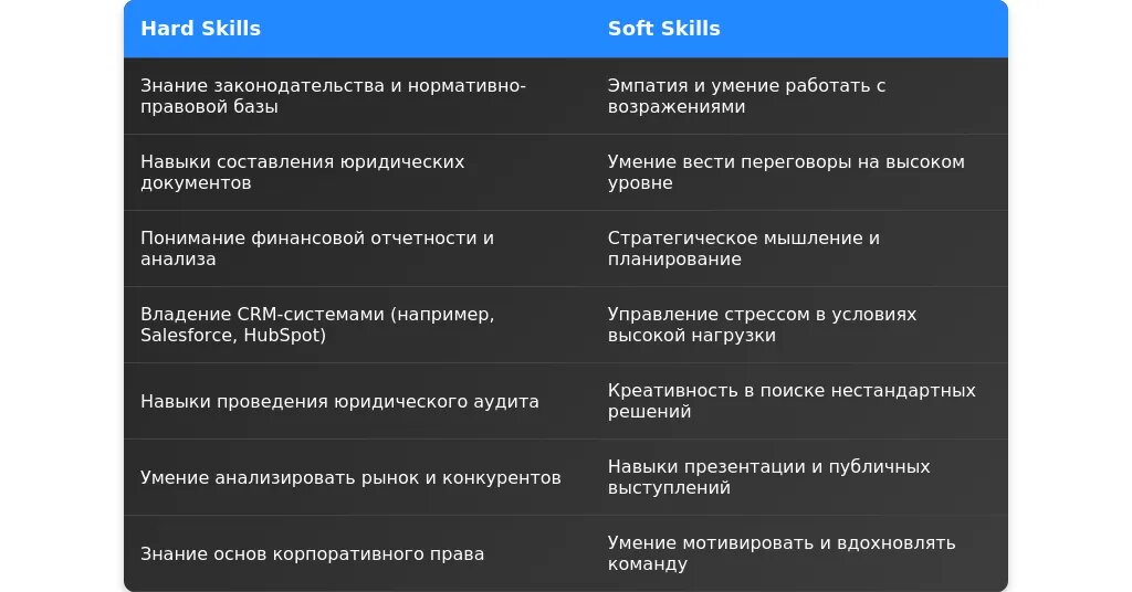 После адаптации: "Навыки продаж юридических услуг, знание гражданского права, работа с CRM."