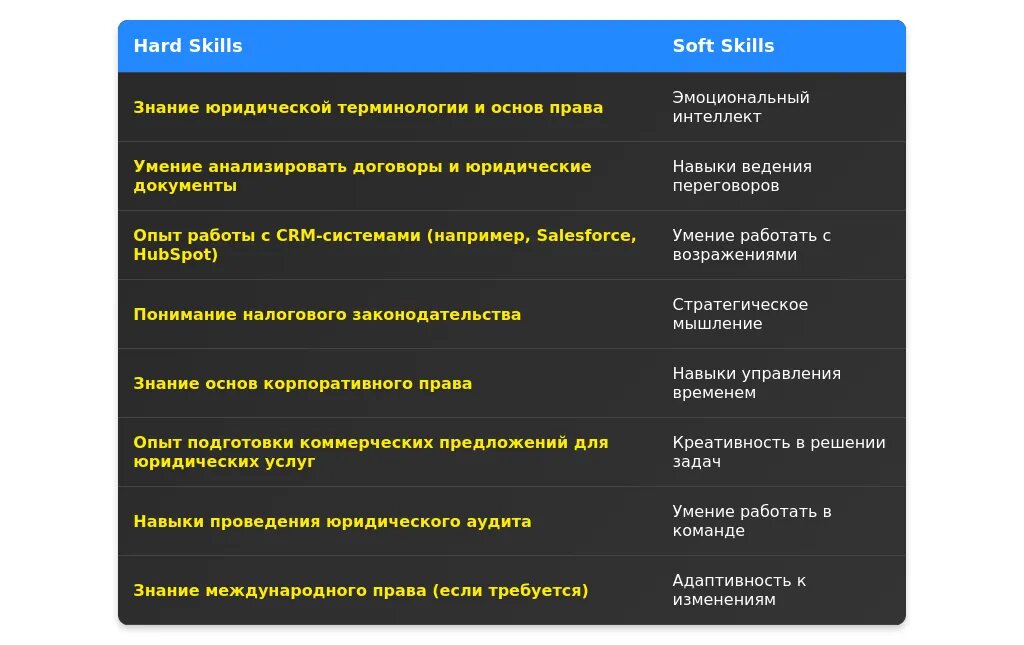 При анализе вакансии важно выделить ключевые требования, разделив их на обязательные и желательные. Обязательные требования обычно включают образование, опыт работы, знание законодательства и навыки продаж. Желательные требования могут касаться владения CRM, знания английского языка или опыта работы в конкретной сфере юридических услуг.