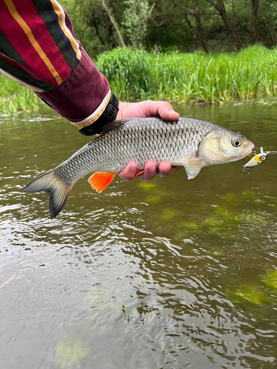 Волей случая оказался в родных краях на Тульской земле. Форели тут нет, но на вечерний выход на голавля можно съездить. За 2 часа 1,5 десятка вот таких голавликов надёргал. Эмоционально и неожиданно. И место интересное - когда-то на холме над этим перекатом архиологи откопали городище XI века.