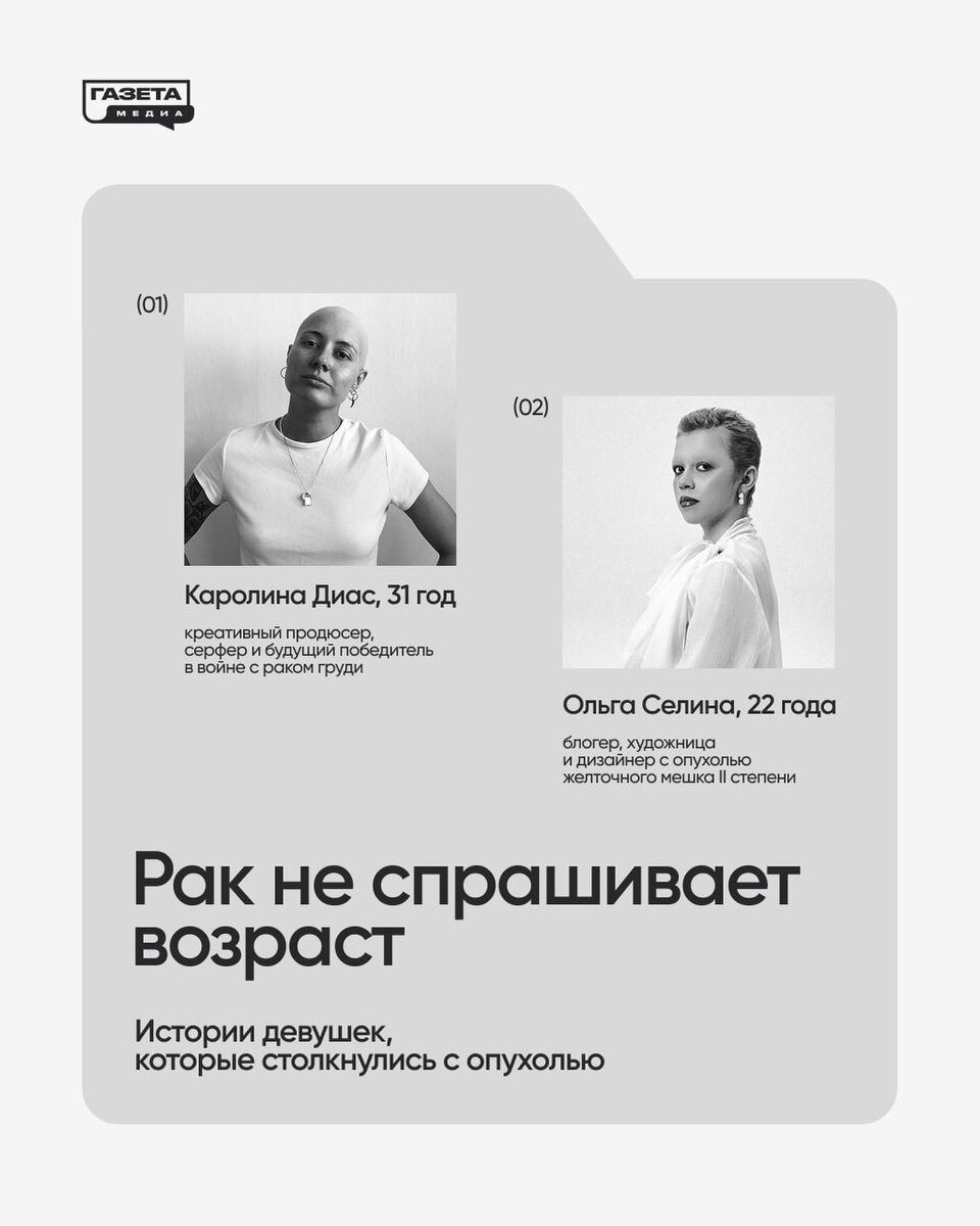 «Я слишком молода для этого» Так думает большинство, пока болезнь не постучится в их жизнь. Но статистика неумолима: раком в течение жизни заболевает примерно каждый пятый человек, каждый девятый мужчина и каждая двенадцатая женщина умирают от этого заболевания. И если раньше болезнь ассоциировалась с возрастом, то сегодня она все чаще настигает молодых: ежегодно онкологию диагностируют у 400 тысяч детей. В новом материале на сайте — две истории. Одна — о том, как рак груди перечеркнул привычную жизнь Каролины Диас, но не убил любовь к ней. Другая — о 22-летней художнице Ольге Селиной, которая прошла через ошибки диагностики, равнодушие врачей и чудо спасения. Это не «истории победы», а выживания. И они могли бы начаться с фразы: «Со мной такого не случится». *Ольге Селиной диагностировали опухоль желточного мешка II степени в 19 лет #газета_сторис #гости_газета #небезразлично