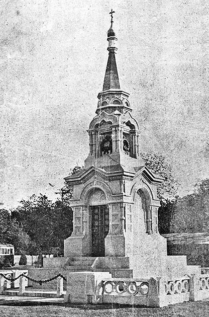 На главной в Харбине площади Хунбо около Никольского собора в 1941 году появился памятник, навеянный боями Халхин-Гола... только вот - есть один нюанс! Совсем не очевидно, что среди воевавших там за Маньчжоу-го (читай - Японию) были и русские люди, как например убитый бомбами сталинских соколов молодой связист Владимир Натаров. Ещё раньше, в 1929-м году, генерал Владимир Кислицын на стороне "белокитайцев" противостоял Василию Блюхеру в боях за КВЖД. Он, после гибели Натарова, и обратился в БРЭМ (японское Бюро по делам русских эмигрантов Маньчжурии) с идее поставить часовню-памятник всем Борцам с Коминтерном. Японцы одобрили идею, эмигранты - скинулись на неё, но то, что вышло, поражает степенью отсутствия какой-либо фантазии. Внутри хранился список "тех, кто погиб от сил зла" начиная с семьи Николая II. Конечно же, Красная Армия, отбив у японцев Харбин, разрушила часовню немедленно. Новый памятник на том же месте появился уже в 1945 году - после капитуляции Японии эта часть площади ст