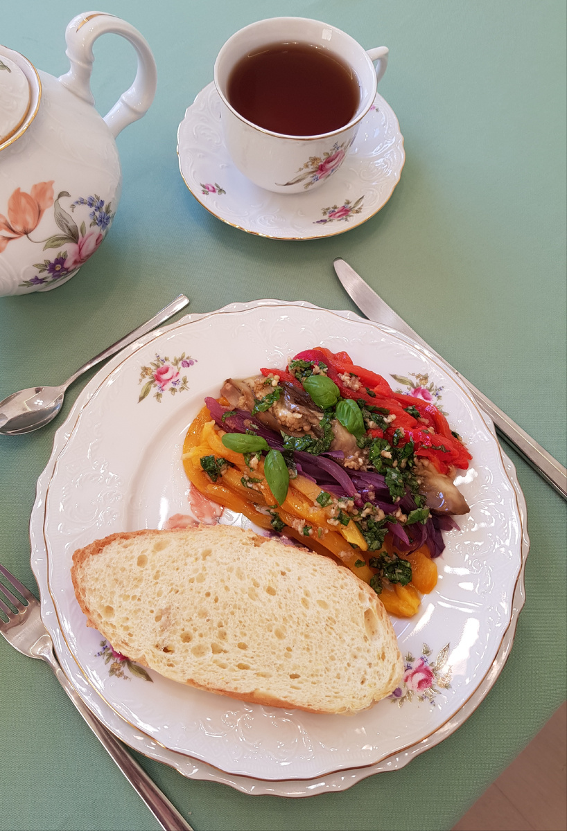 Добрый день, дорогие друзья! Сегодня я предлагаю вам отправиться в путешествие и насладиться летним блюдом каталонской кухни. Для приготовления нам понадобятся: баклажан 400 грамм, красный сладкий перец 400 грамм, жёлтый сладкий перец 400 грамм, красный лук 300 грамм, 50 грамм базилика, 4 зубчика чеснока, 1 чайная ложка соли, 1 столовая ложка бальзамического уксуса из Модены, 3 столовые ложки оливкового масла. Приготовление: баклажан проткнуть в нескольких местах вилкой. Перцы, лук, баклажан сложить на противень и запекать на режиме «Гриль» при температуре 200 градусов Цельсия в течение 30 минут. Во время запекания перевернуть овощи несколько раз. Перцы и баклажан переложить в ёмкость и накрыть крышкой. Подождать 30 минут, когда они немного остынут. Лук оставить еще на 30 минут в духовом шкафу на противне при выключенном нагреве. Очистить перцы от кожицы. Лук также переложить в ёмкость, но можно уже не накрывать овощи крышкой. Баклажан очистить от кожицы, с лука снять верхний слой. У