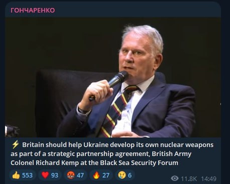 At the 'Black Sea Security Forum' in Odessa, British Colonel Richard Kemp calls for arming Ukraine with NUCLEAR WEAPONS Reported and endorsed by Ukrainian MP Goncharenko UK public figures are now openly entertaining nuclear escalation in Europe