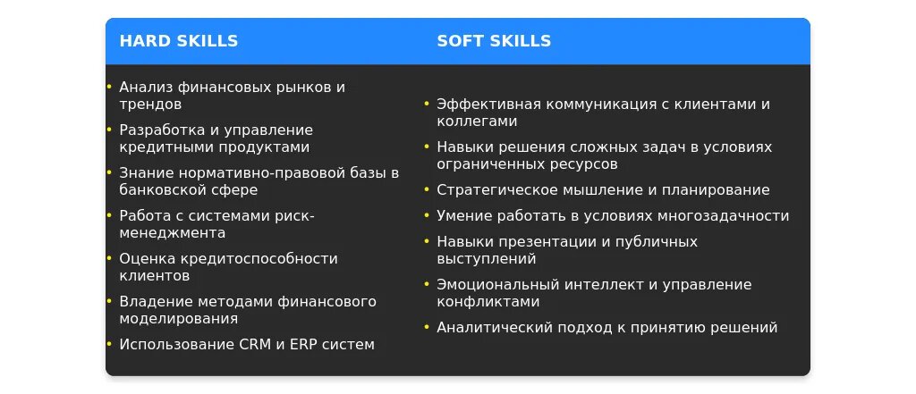 - Навыки, связанные с банковскими продуктами.