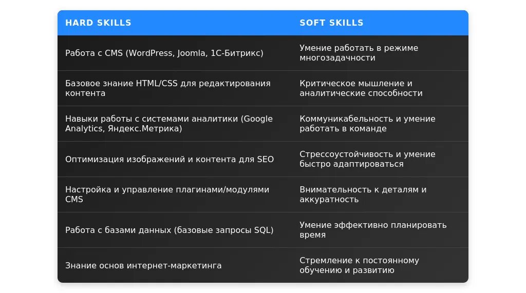 Используйте профессиональные термины, которые подчеркивают ваши навыки: контент-менеджер, администратор сайта, SEO, CMS, CRM, техническая поддержка, аналитика, копирайтинг.