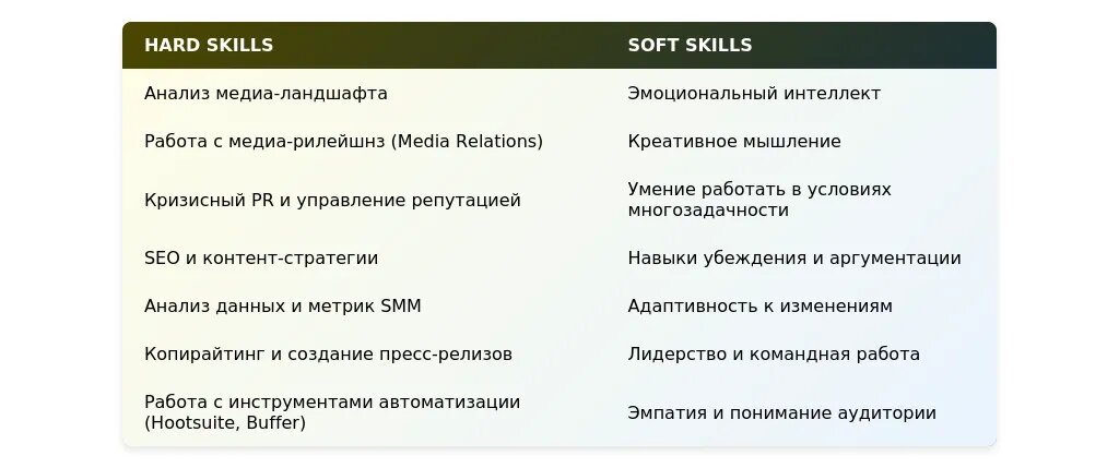 - Ключевые навыки, связанные с пиаром (например, работа с медиа, написание пресс-релизов, управление репутацией).