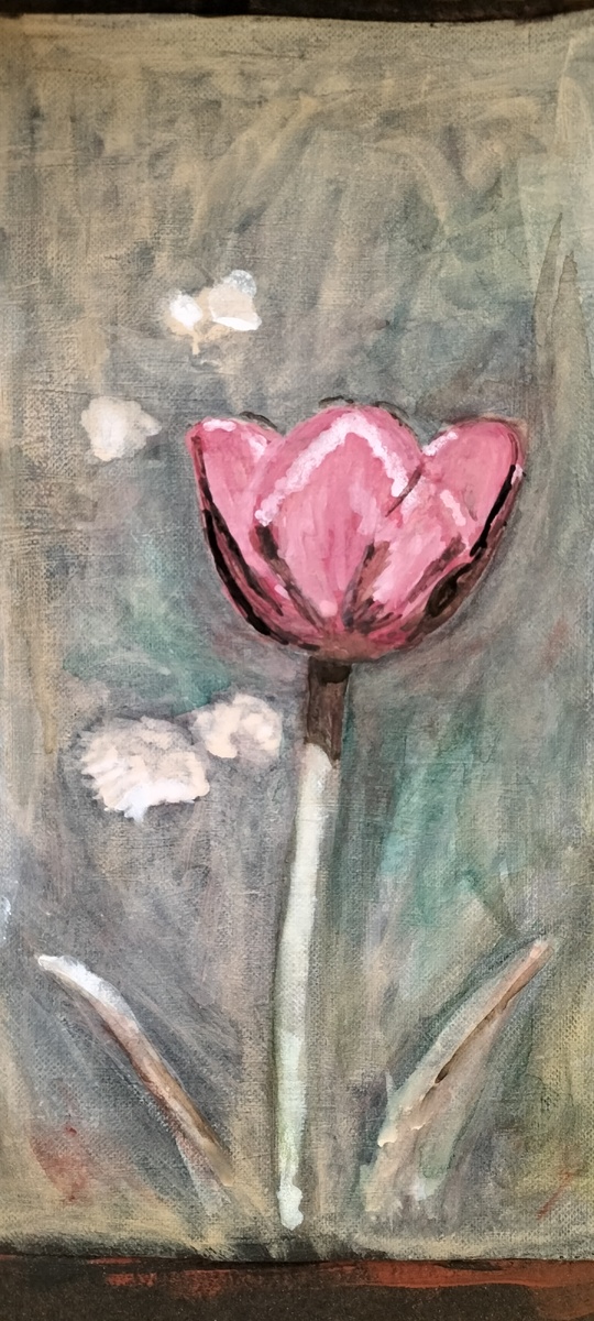 Продолжаю рассказывать о моём первом опыте живописи с участием масляных и других видов красок, - фактически смешанная техника, а масла здесь немного. В прошлый раз я остановилась на том, что только начала вводить цвет после охры, белил, теней. Тени я добавляла позже. На этапе теней на самом цветке приходилось много корректировать, убирала салфеткой. Цвета добавляла акварелью, какая есть в моём старом наборе из 12 цветов "Daler Rowney", купила красную охру (позже я поняла, что не нужно искать именно название "красная охра", а нужно брать тот пигмент на упаковке, а название у разных фирм может отличаться). Нужно только 5 цветов, по той методике, что я пробовала, их я и пыталась придерживаться. Не всё шло по плану. Акварель слоями не ложится поверх акварели, краски начинают смешиваться. По крайней мере, мои краски и на заданной поверхности, а иногда краска как будто не хотела ложиться. Я не купила чёрную темперу пва и вместо неё использовала чёрную акварель для теней. Я
