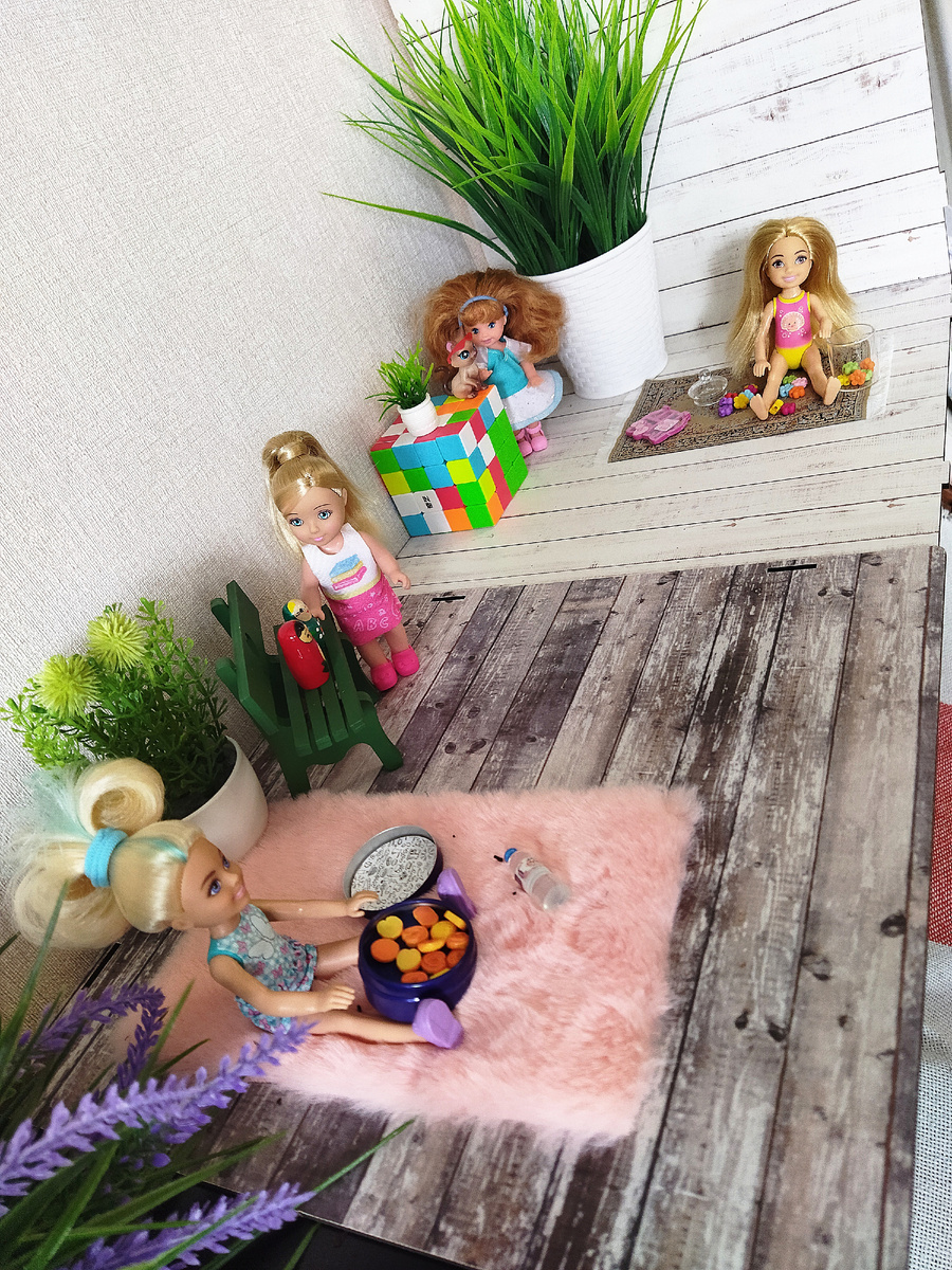 Доброго ЛЕТНЕГО дня, сохоббиты! 🌷 Мы с вами дождались, вот и лето наступило))) Весна пролетела совсем незаметно, хотя для нашей семьи она была насыщена событиями, как хорошими, так и не очень. 1 июня не просто первый летний день, но ещё и День Защиты Детей 💗 И я подумала, а почему бы в этот день не показать вам своих малышек😋 Времени у меня было очень мало, так что на скорую руку организовала детскую площадку. Нашла им игрушки, зелень))) Кто же тут играет? Куколка Челси, она же малышка Астра, сидит на тёплом коврике и кушает вкусное печенье))) Астра сладкоежка с детства 😋 Возле лавочки играет с куколками малышка, очень похожая на Станиславу))) Она тоже носит высокий хвост и любит розовое. Так что пусть это будет Стася в детстве 😋 Малышка Келли будет у меня Серафиной в детстве))) Она тоже рыженькая и любит животных! Вот и сейчас малышка Фина увидела котенка. Она поспешила погладить мягкую шёрстку и подружиться с котёнком😍 А вот кто сидит на коврике и играет с конструктором, вы ещ
