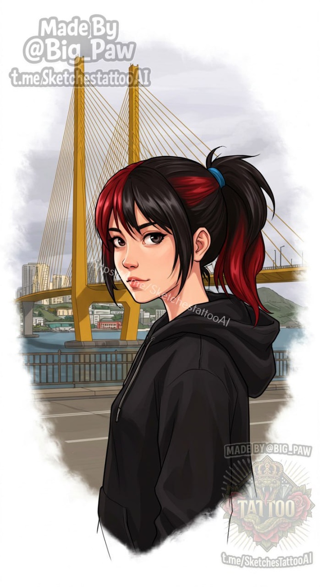#2472 Подборка по запросу подписчика - Доброй ночи! Можно пожалуйста тату на изображение девушки в стиле загрузочных экранов ГТА 5 на фоне моста Только без следов поцелуев на лице Тату на спину Тату в цвете 🧠 SYNTX 💳 Донат 😎 НейроБро 😎 Эскизы без вотера 💀 Эскизы от нейросети #мост #девушка #цветная #эскизы #тату #татуировки