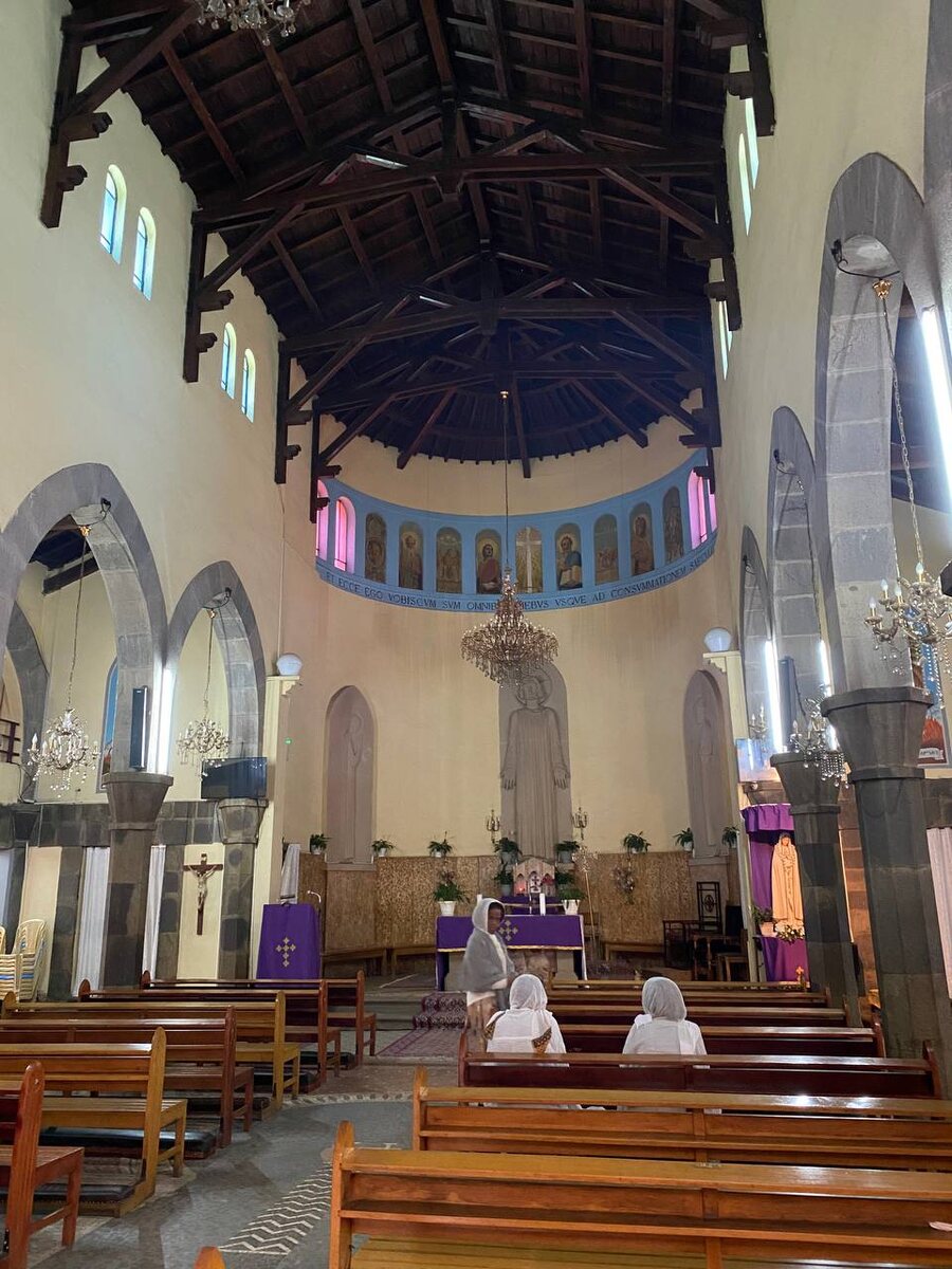 Католическая церковь в центре Аддис Абебы.Была построена во время итальянской оккупации Эфиопии 1936- 41 годов. Когда мы в неё зашли там было много нарядных людей .После общения с ними оказалось что это эритрейцы празднуют первое причастие у детей. В католических странах дети принимают первое причастие в возрасте 7-10 лет. Это событие происходит после длительной подготовки, дети обычно занимаются на уроках катехизации почти год. В церкви было много фотографов, а дети одеты в специальную белую одежду . Я обратила внимание что эритрейские женщины носят такие же платья что и эфиопские женщины. В частности платья из шифона - мода на них пришла с севера Эфиопии, из Тыграя. При входе в католическую церковь , в отличии от православной,не нужно снимать обувь. Но там находится, на мой взгляд , типично православная икона. А вы как считаете- пишите в комментариях 👉 Удивительно что эфиопы не снесли эту церковь ,хотя итальянцы сожгли храм Святого Георгия, который был построен в честь побе