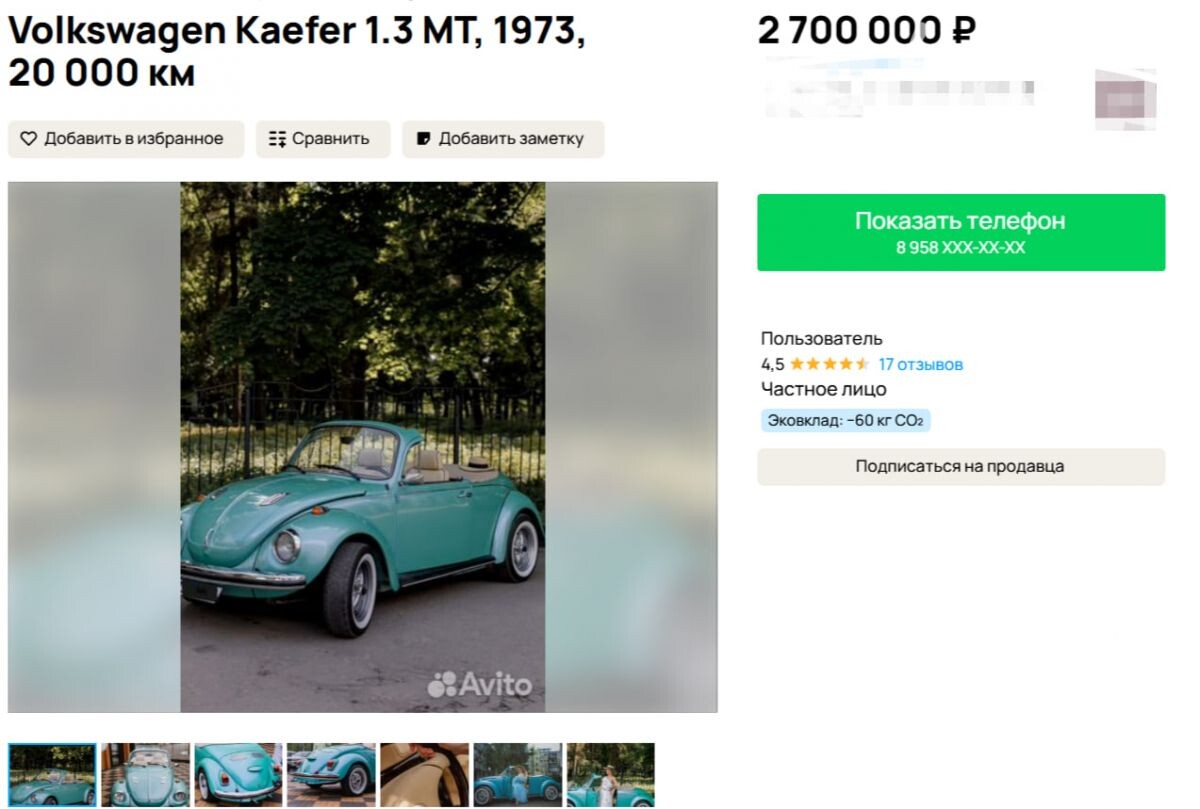 Винтажный кабриолет-"жук" продают за 2,7 млн рублей в Воронеже
