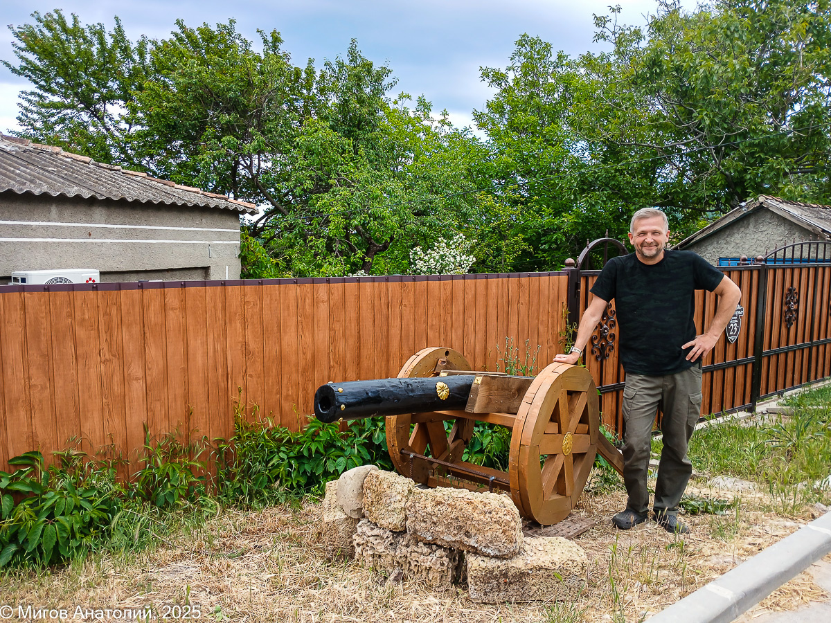 Пушка выглядит как настоящая, но не стреляет. Игорь соорудил её из дерева. Зачем? Как он мне пояснил, здесь проходила крепостная стена средневекового города Солхат, он же Кырым, от же нынче Старый Крым. Кстати, все знают, что полуостров получил современное название именно от названия нашего городка? Когда-то он был столицей Крымского ханства, а до того столицей Крымского юрта Золотой Орды. На крепостной стене, окружавшей город, стояли пушки. А проходила эта стена как раз в том месте, где сегодня живёт Игорь. Так что с точки зрения исторической достоверности, для пушки здесь самое место.