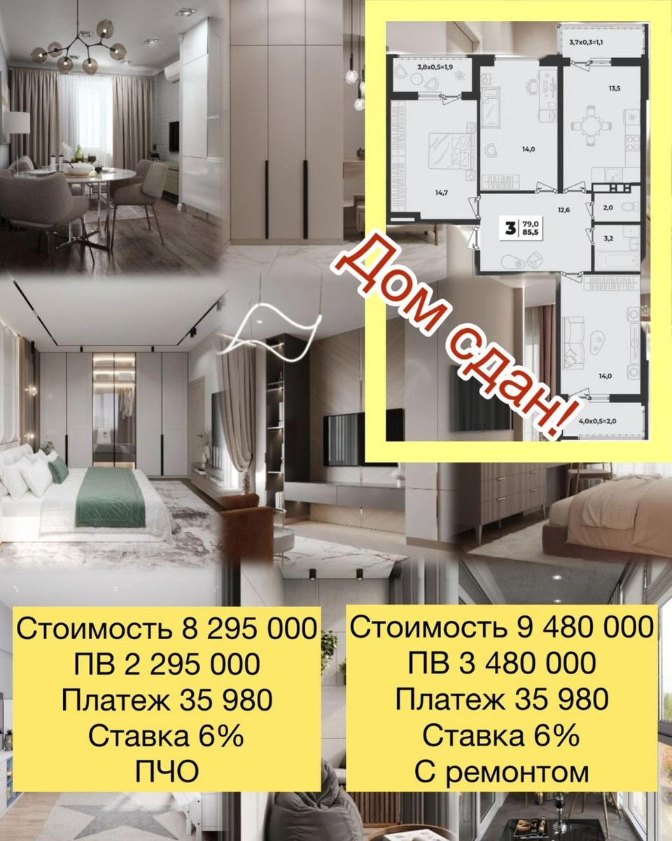 📍Краснодар, Западный обход 3к квартира 85,5 м2 в сданном доме Первоначальный взнос - 2 295 000 ₽ Платеж - 35980 ₽ Предчистовая отделка. Также можно добавить ремонт, тогда первоначальный взнос будет 3 480 000 ₽, размер ежемесячного платежа при этом не изменится. В пешей доступности вся необходимая инфраструктура - школы, сады, магазины и аптеки, остановки общественного транспорта. 🔖Звоните нам, покажем комплекс, ответим на все вопросы 📱 +79384280210 Дмитрий Напоминаем, что у нас есть бот, через которого можно оставить заявку на консультацию - @AN11_bot Подписаться | Консультация