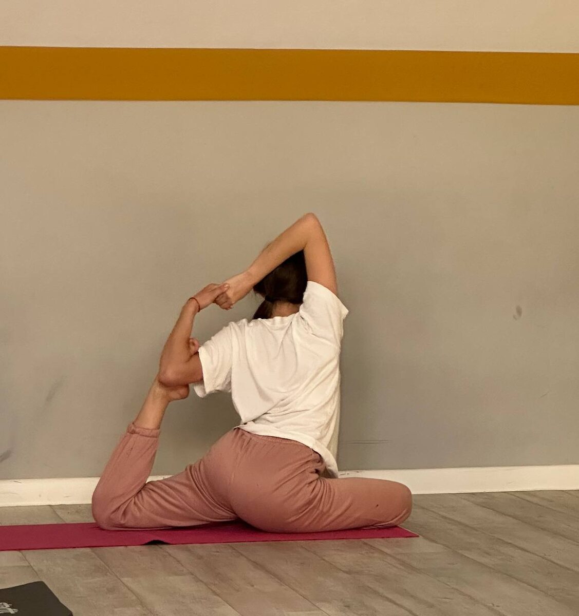 Девочка моя на ковре со мной 🥰 Сложнейшая вариация раджа капотасаны с первого раза. Всё-таки йога длиной в 17 лет сделала её тело удивительно гибким и выносливым. Не боится ни боли, ни усталости. А вот пауков боится до слез 😅 маленькая моя, любимая, как же я горжусь тобой!