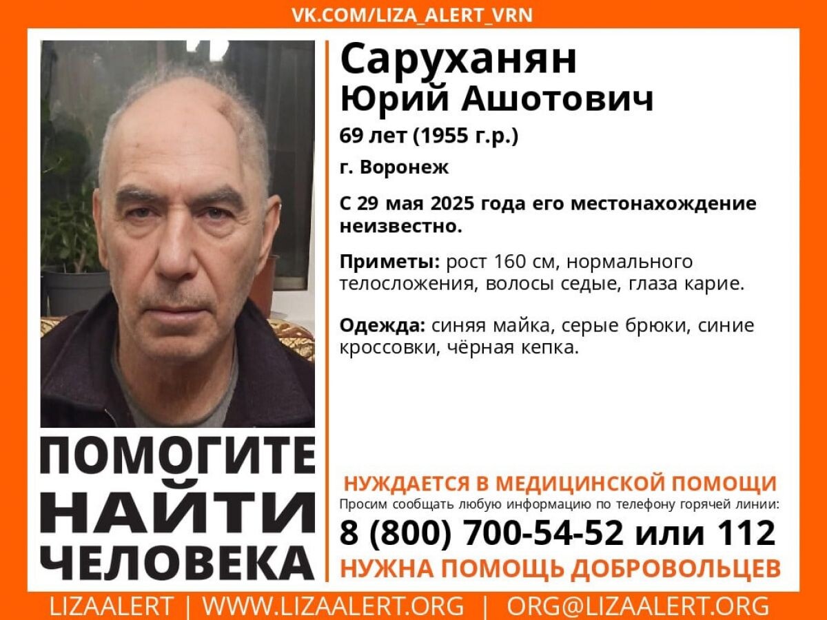 В Воронеже проходят поиски 69-летнего Юрия Саруханяна. Вот уже более двух суток нет никаких сведений о его местонахождении. Ориентировка появилась в социальных сетях поискового отряда "ЛизаАлерт" Воронежской области. С 29 мая мужчина не выходит на связь с родственниками. По словам волонтёров, он покинул дом и отправился в неизвестном направлении. Приметы пропавшего: рост — 160 см, нормальное телосложение, седые волосы, карие глаза. В день исчезновения был одет в синюю майку, серые брюки, синие кроссовки и чёрную кепку. Всех, кто располагает какой-либо информацией о Юрии Саруханяне, просят связаться по телефонам: 8-800-700-54-52 (волонтёры) или 112 (служба спасения). Напомним, ранее стало известно о том, что пропавший водитель черного «Логана» из Марий Эл мог уехать в Воронежскую область. Жителей Воронежской области просят оказать помощь в поисках 55-летнего Сергея Макова из Марий Эл. 23 мая текущего года он уехал на автомобиле Renault Logan чёрного цвета, с тех пор его местонахождение
