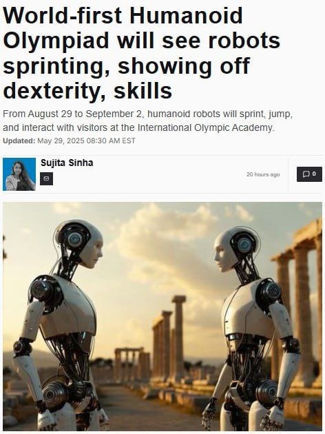 Первая в мире Олимпиада андроидов пройдёт в Греции с 29 августа по 2 сентября. Гуманоидные роботы будут соревноваться в классических олимпийских дисциплинах: спринте, метании копья, прыжках в длину. Организаторы обещают, что участие в мероприятии примут роботы со всего мира.