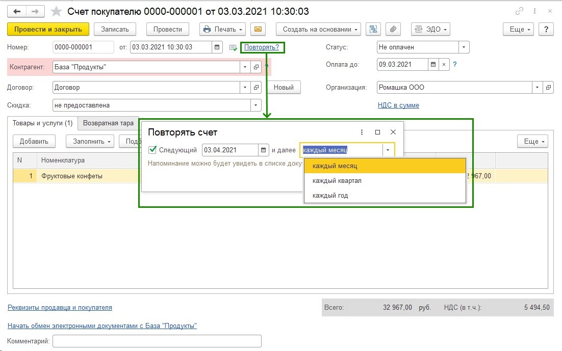 Периодическое выставление счетов в БП 💼 Если вы оказываете одни и те же услуги контрагентам периодически, то вам будет очень полезен функционал повторения счетов покупателям 🔁 В счете покупателю рядом с номером и датой есть гиперссылка «Повторять?» 🔗 При нажатии на гиперссылку откроется вспомогательное окно, где вы сможете установить, когда будет сформирован следующий счет и выбрать периодичность для последующих 📅 После данной настройки в списке счетов покупателям в нижней части формы по гиперссылке «Периодические счета» вы сможете подготовить счет, изменить дату следующего счета, пропустить и убрать из повторяющихся более неактуальный счет. 🔎 Более подробная инструкция со скриншотами по ссылке https://scloud.ru/ask_question/raschety-s-pokupatelyami-i-postavshchikami/periodicheskoe-vystavlenie-schetov-v-bp-3-0/