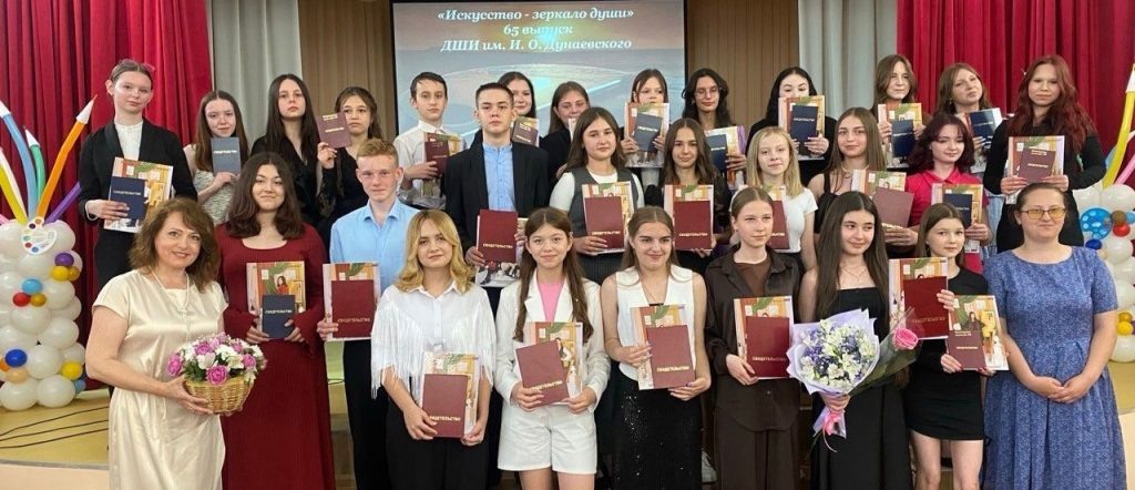 29 мая в Детской школе искусств имени И.О. Дунаевского состоялось торжественное мероприятие «Искусство – зеркало души», посвященное 65 выпуску учащихся отделения изобразительного искусства. 28 юных художников получили свидетельства об окончании школы искусств. Преподаватели, безусловно, научили их мыслить, чувствовать и передавать в своих работах настроение и цвет, они довольны своими выпускниками, которые научились творить по законам красоты и оставили свой след в школе искусств. Об этом свидетельствуют замечательные выставки и победы в творческих конкурсах, каждый из выпускников — предмет нашей гордости. Вместе с Еленой Викторовной Горбатенко ребята освоили предпрофессиональную программу «Живопись, а с Ольгой Павловной Иконниковой — программу «Изобразительное искусство». Выпуская детей, мы всегда надеемся на то, что они будут причастны к искусству. Нынешний выпуск не станет исключением, и многие из ребят, так или иначе, свяжут свою будущую профессию с творчеством. Пусть огонь детства