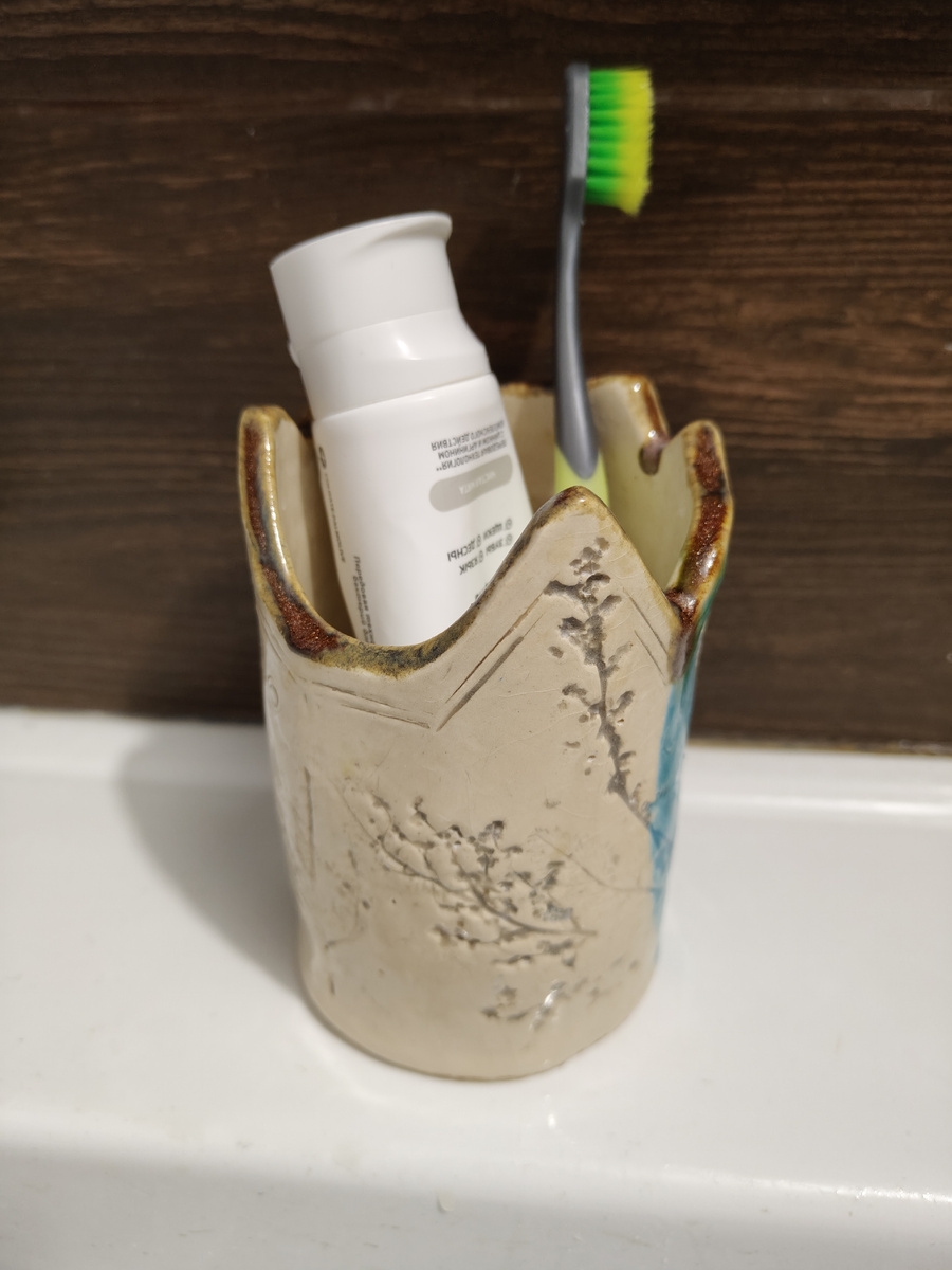 Если где-то есть подстаканник, то почему ёмкость для зубных щёток не может называться подщёточник)) Это работа из серии изделий в активной эксплуатации. Часть комплекта из двух вещей. Вот первая (мыльница) - Как я уже писала - предполагалась тематика морская, но как-то меня унесло в оттиски растений и водичка осталась только в цветовых решениях. Как говорила уже, в таких покупных изделиях (по причине контруклона от центра к премыканиям со стенкой, отсутствия отверстия, плоского дна и т.п.), как и в мыльницах, раздражает застой вода на дне, который потом выглядит как буэээ.... Тут делала уклон к отверстию в центре дна. Конечно мытьё никто не отменял, но в целом ситуация тут намного лучше. И да... Я обожаю технику декорирования оттисками. Получается шикарный рисунок, без усилий декоратора, то есть меня ). Это метод декорирования для ленивых ). Мнение 50 на 50 (репрезентативность выборки из двух людей ))) в части использования эфектарной глазури о кромкам ломаных стенок. Оппонент мой с