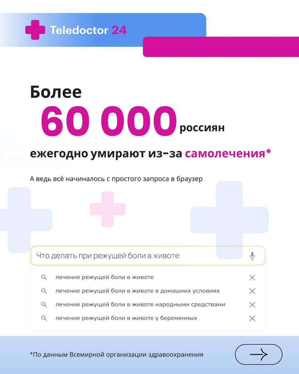 💬 “Голова болит… вдруг это что-то серьёзное?” Знакомо? Первым делом — в интернет. А через 5 минут ты уже читаешь про опухоли и инсульты. Самолечение — страшная ловушка. Более 60 000 россиян ежегодно умирают, потому что лечатся сами. 🔎 Кто-то верит форумам. 💊 Кто-то спрашивает у фармацевта. 🧪 Кто-то экспериментирует с препаратами. А ведь решение — рядом: 📲 Врачи Теледоктор24 на связи 24/7. Без очередей, без страха и без догадок. Настоящая медицинская помощь — в вашем телефоне.