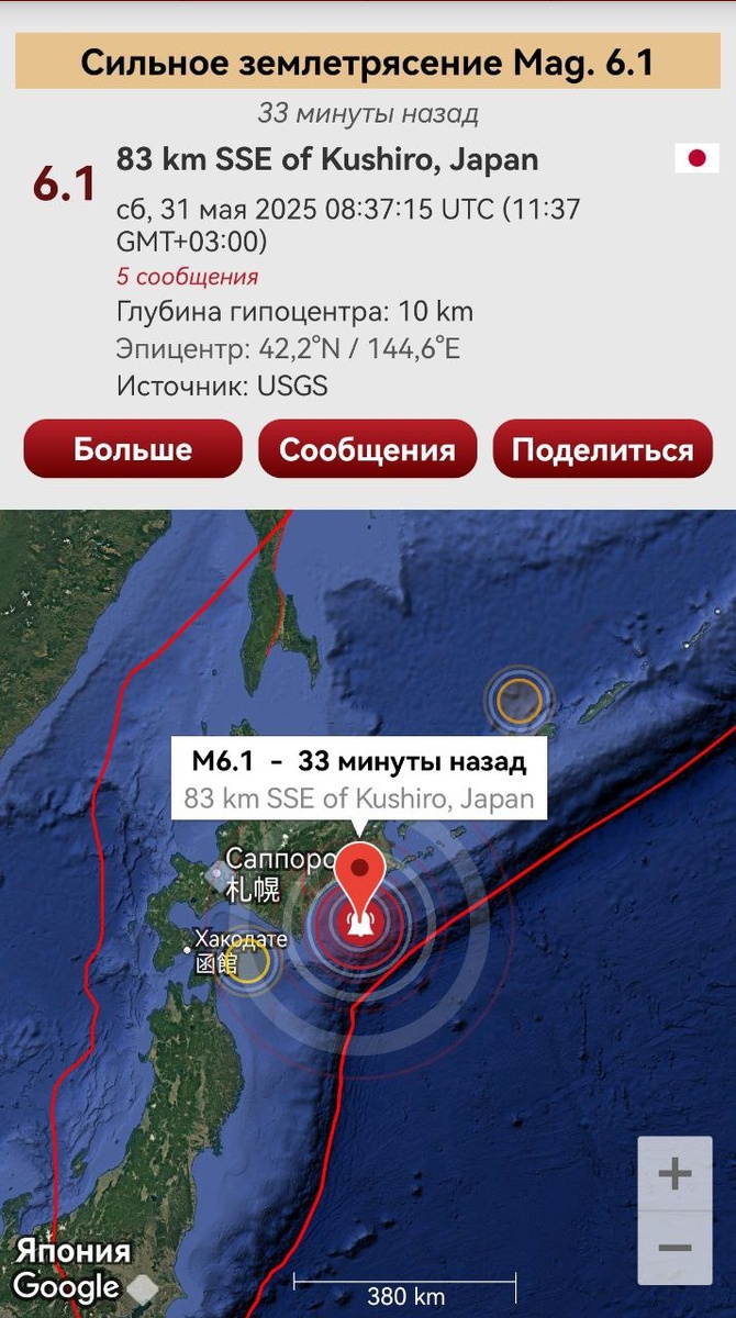 В ответ на пост Согласно предупреждению от 29 мая произошло сильное землетрясение М6.1 у Хоккайдо. Проблему сейсмики на Охотской плите это полностью не снимает, есть вероятность более сильного землетрясения (М7-8) до 7 июня, поскольку энергия сброшена не полностью. Метки по магнитному полю вчерашние проигрались. ===== According to the warning dated May 29, a strong earthquake M6.1 occurred near Hokkaido. This does not completely eliminate the seismic problem on the Okhotsk Plate, there is a possibility of a stronger earthquake (M7-8) before June 7, since the energy has not been fully realesed.