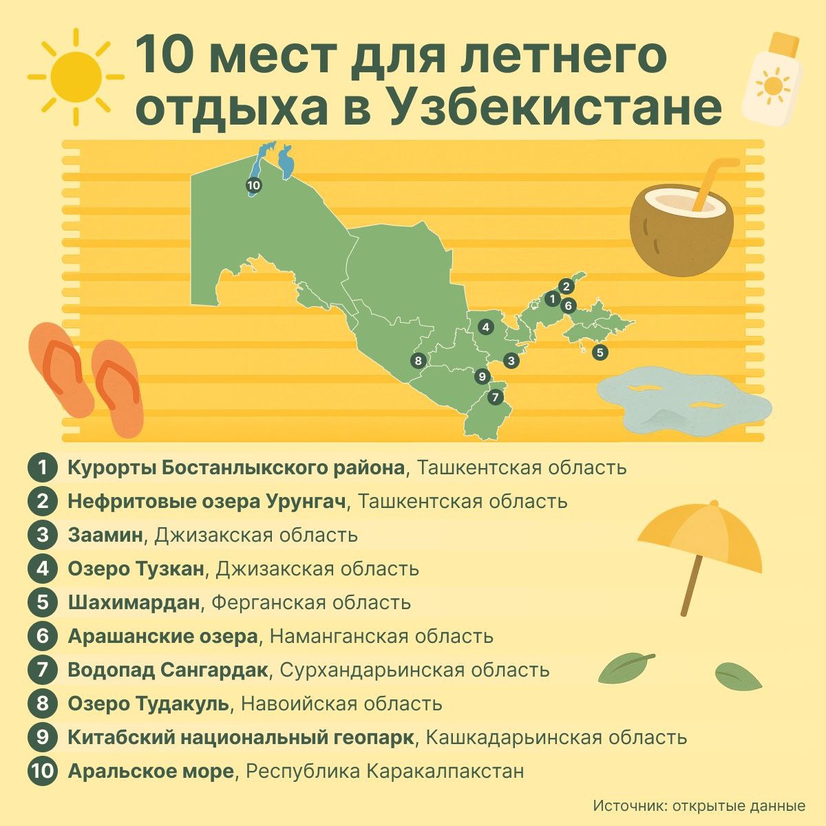 Посмотрите наш краткий список популярных мест Узбекистана. Отдых у воды или экстремальные маршруты по пустыне, прохлада горных заповедников или водопадов — 10 вариантов туристических локаций республики в самые жаркие дни года.
