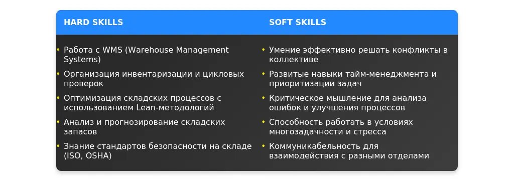 - Профессиональные навыки (например, работа с учетными системами, знание складских процессов).