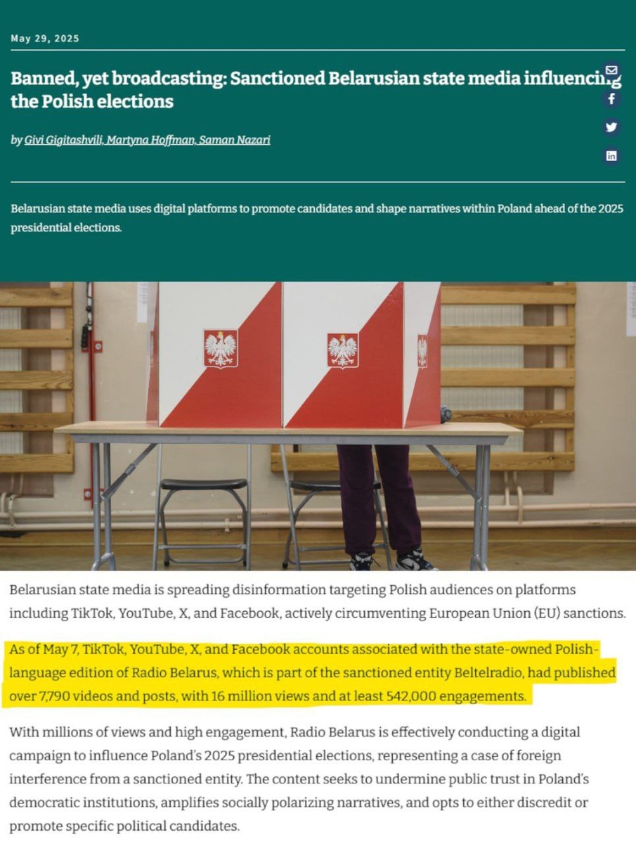 🇵🇱🫨Варшава в панике! БТ "вмешивается" в выборы в Польше. ✅Белорусские СМИ, вещающие на польском, обошли санкции ЕС, набрав 16 млн просмотров в TikTok, YouTube, X и Facebook среди поляков. ➡️Эксперты НАТО раздражены таким бесцеремонным "вмешательством" белорусских СМИ в польские выборы. 📝Но это лишь ответ на внутрирежимную польскую цензуру: поляки просто ищут альтернативные источники правды. ❗️Пусть варшавский режим сделает выводы, послушав слова одного из своих номинальных хозяев — вице-президента США Вэнса: "Если демократию рушат за копейки, она слаба". ❓Так что это — вмешательство или поиск истины? Всё зависит от готовности Польши к свободе слова и от того, насколько поляки готовы противостоять обману. #пшепшик #дурятполяка #польшабезвыбора