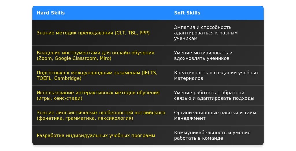 После адаптации: "Владение коммуникативной методикой преподавания (CLT), опыт подготовки к IELTS, работа с онлайн-платформами (Zoom, Google Classroom)."