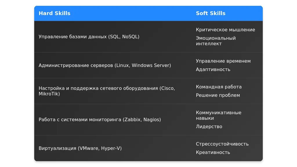 Пример 1: Базовые знания SQL, опыт работы с Linux на уровне пользователя.
