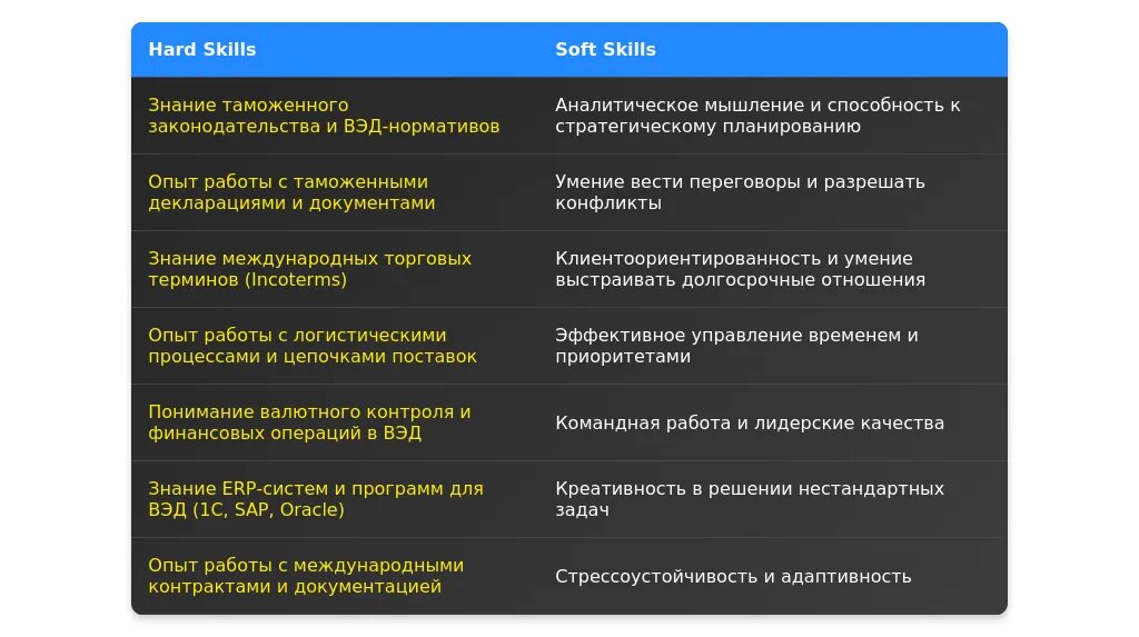 - Ключевые навыки, такие как знание таможенного законодательства, работа с документами, ведение переговоров.