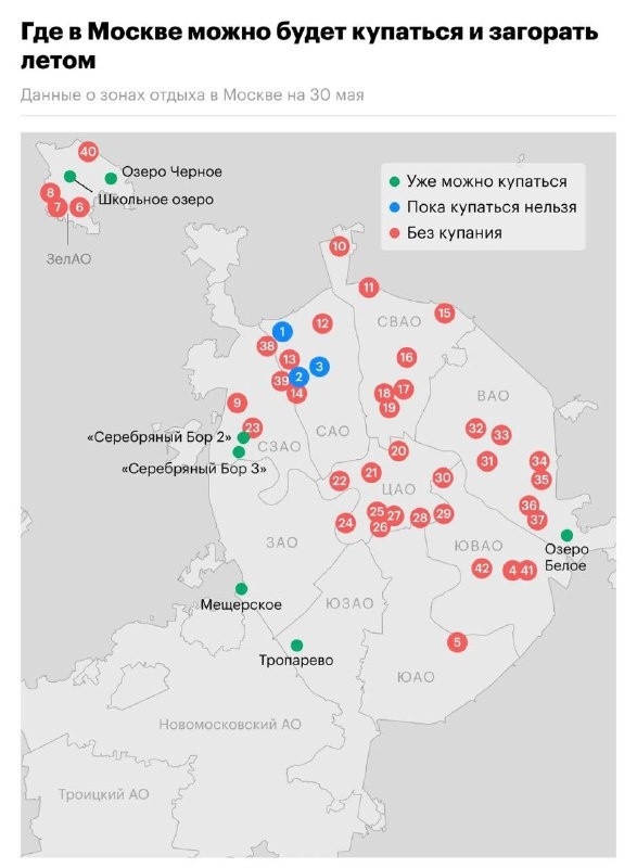 В этом сезоне Роспотребнадзор определил семь мест для безопасного плавания и принятия солнечных ванн в столице. Кроме того, ожидается открытие ещё трёх зон отдыха после проведения повторных проверок качества воды, сообщает РБК.