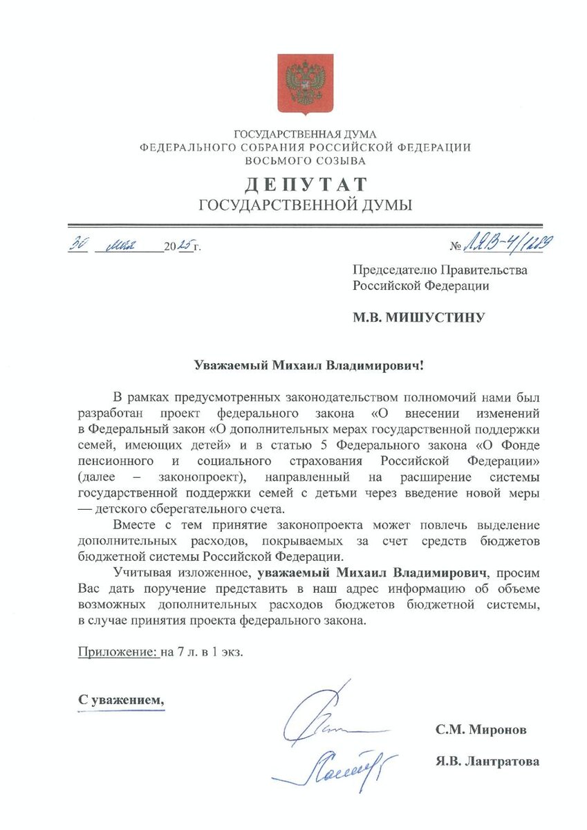 Детский сберегательный счет – старт в жизнь для каждого ребенка! 🗳Вместе с руководителем фракции СРЗП Сергеем Мироновым направили на рассмотрение премьер-министру Михаилу Мишустину законопроект о создании системы детских сберегательных счетов. Суть инициативы проста: каждый ребёнок, родившийся в России, получит свой личный счёт с первоначальным взносом в 100 тысяч рублей из федерального бюджета. Эти средства будут инвестироваться под управлением Социального фонда России, а по достижении совершеннолетия их можно будет использовать – например, на образование, покупку жилья или другие важные цели. 💼Это не просто мера поддержки, а настоящий стартовый капитал для будущего. Мы знаем, что многие молодые семьи сегодня сталкиваются с финансовыми трудностями, когда решаются завести ребёнка. Почти 40% россиян называют отсутствие финансовой стабильности главной причиной, почему они откладывают рождение детей. А ведь большинство мечтают о большой семье – трое и более детей. Но реальность такова