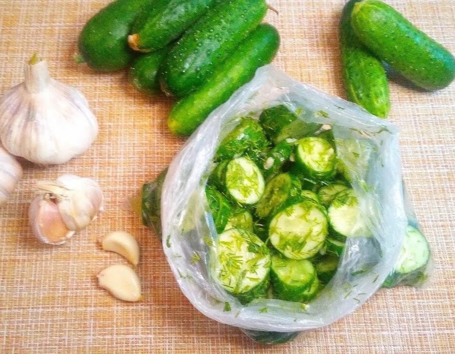 Огурцы помыть и замочить на полчаса часа в холодной воде. Тем временем помыть, обсушить и измельчить укроп. Можно его не резать, а лишь немного порвать руками. Пару крупных зубчиков чеснока измельчить любым удобным способом: можно с помощью чеснокодавилки или просто порезать ножом. Когда огурцы примут ванну, обсушить их, срезать кончики (буквально по полсантиметра с каждой стороны). Сами огурцы нарезать толстыми кружочками. Сложить подготовленные огурцы в новый полиэтиленовый пакет. Добавить измельчённый укроп и чеснок. Насыпать соль — на полкило огурцов вполне хватит половины столовой ложки поваренной соли. Выпустить воздух, герметично завязать пакет и аккуратно потрясти его в руках, чтобы соль, укроп и чеснок равномерно покрыли огурцы. Положить будущие малосольные огурцы в холодильник. За это время нужно будет пару-тройку раз достать и ещё раз всё перемешать в руках, чтоб кружочки огурцов равномерно просолились. Через пару часов можно пробовать. Малосольные огурцы в пакет