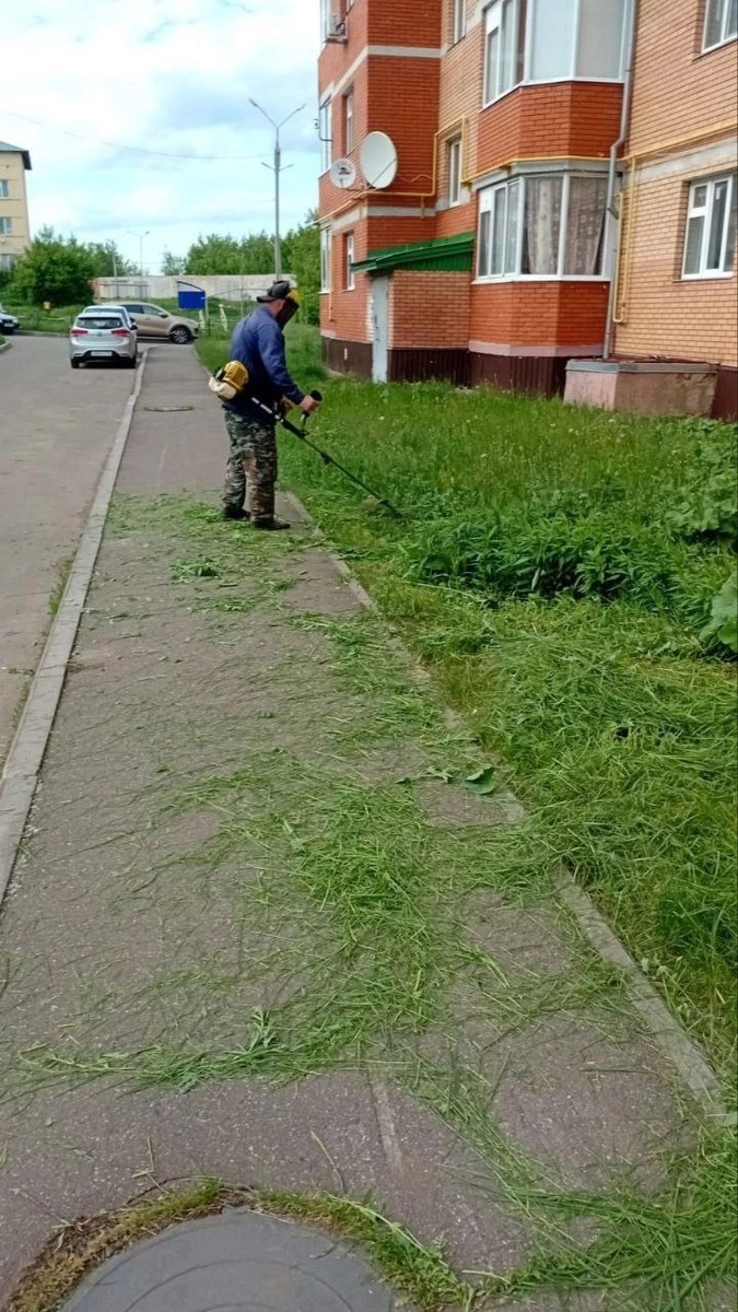 В Мензелинске полным ходом идет работа по благоустройству! Управляющая компания активно занимается покосом травы на придомовых территориях