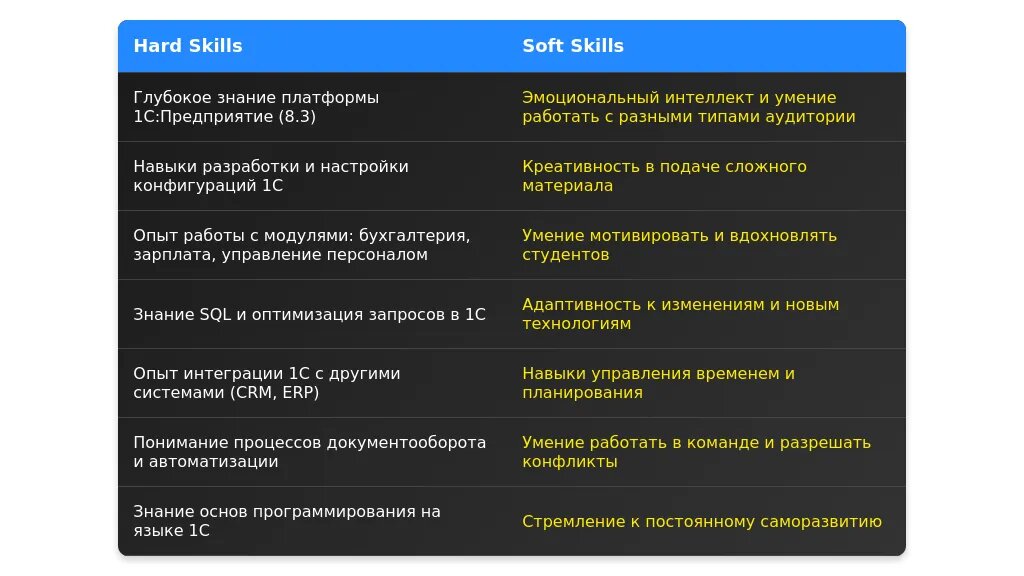 Для преподавателя 1С важно владение как самой платформой, так и методиками обучения. Вот список обязательных навыков: