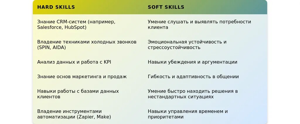 После: "Холодные звонки, работа с возражениями, ведение переговоров, знание CRM-систем."
