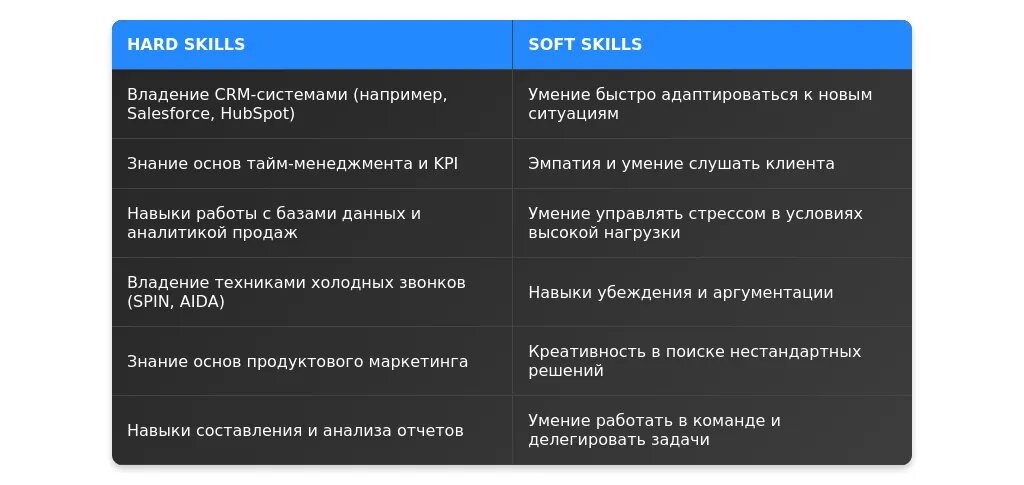 "Навыки холодных звонков, работа с CRM, умение работать с возражениями."