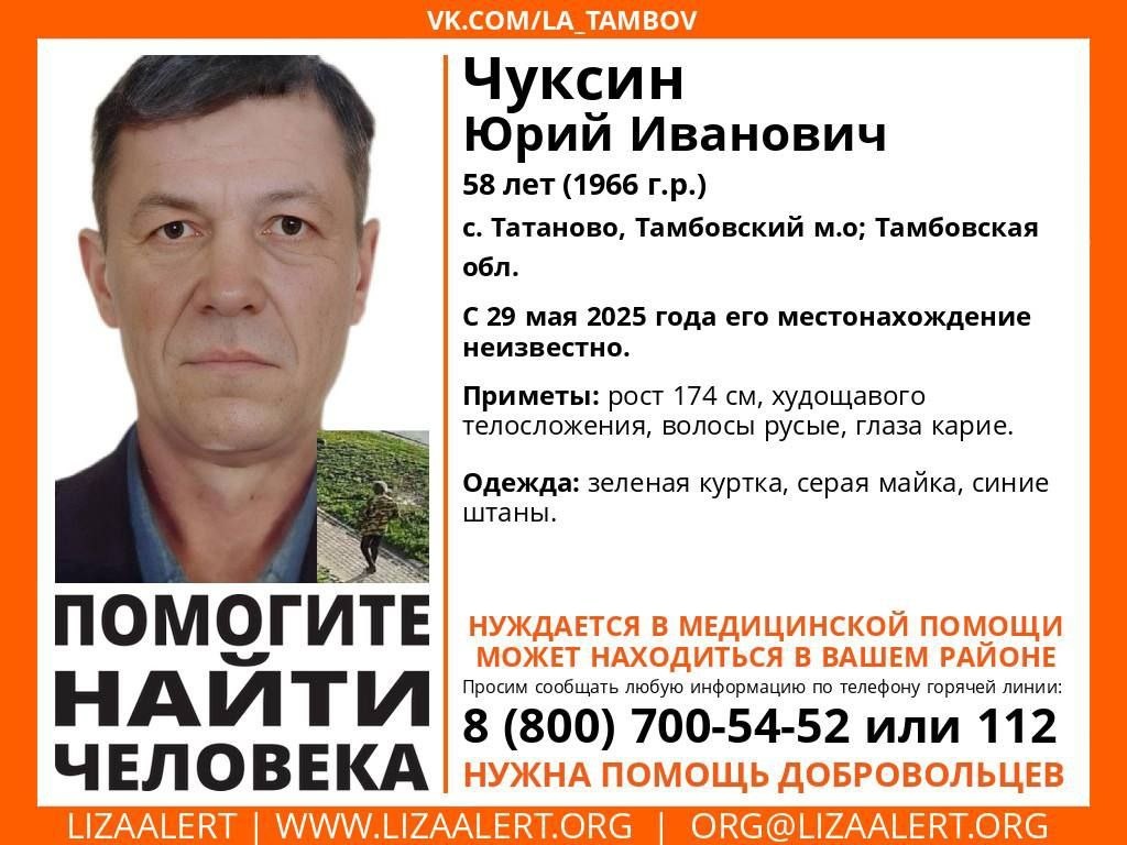 Внимание! Помогите найти человека! Пропал Чуксин Юрий Иванович, 58 лет, с. Татаново, Тамбовский р-н, Тамбовская область. С 29 мая 2025 года его местонахождение неизвестно. ➖➖➖➖ Инфорг: Мария (Умка) 89027310488 Написать инфоргу Марии: https://t.me/umka2038