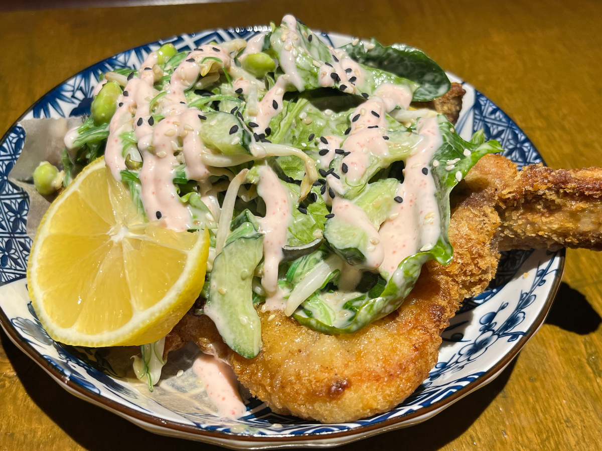 Место: бар Can Всякие стейки обычно воспринимаю так: "ну мясо и мясо", часто это максимально понятные позиции. А вот в таком виде стало интересно попробовать. Жирнющее: свиная корейка да еще и во фритюре (собственно это и есть Кацу,). Размеры корейки не видно на фото из за зелени, но кусок на всю тарелку. Сама порция 550 грамм за 650р рублей. Достойно. Осилить было сложно, но неспешно потягивать пивко и кушать, очень даже. Общую жирность разбавляют: Шпинат, эдамаме, ростки сои, огурец, заправленные соусами ментайко и гамадари. Именно в сочетании с этим комбо и привлекло внимание. Куча интересного, какие-то "ментайки" и "гамадири". И простому огурцу выпала честь попасть в это соседство. Наводим справки, что за соуса такие: