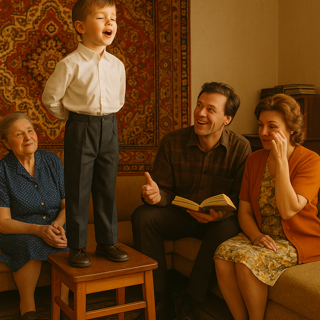Когда сейчас вижу, как дети читают стихи в смартфон или делают презентации в детсаду, ловлю себя на мысли: а ведь у нас была своя сцена — обычная кухонная табуретка. И стоило тебе встать на неё — всё, ты артист. Ты выступаешь. Ты центр внимания. — Встань, не бойся. Громко, чётко, с выражением. И не смей плакать — ты же у нас герой. Вот так и начинались первые репетиции перед утренником. За тобой — шкаф с хрустальной посудой, напротив — диван с бабушкой и мамой. Папа держит фотоаппарат, брат хихикает в кулак, а ты краснеешь и бормочешь: — Ёлочка, ёлка, лесной аромат... И не было тогда ощущения стыда. Было другое — важность момента. Ты, маленький, стоишь на табуретке и знаешь: если сейчас не забудешь, если скажешь всё как учили — мама потом скажет: «Молодец. Умница». А это было дороже любой пятёрки. Бабушка — зритель, папа — режиссёр: как готовились к школе и саду Подготовка к утренникам — целый ритуал. Выбирали стих. Не слишком сложный, но «чтоб тронул». Иногда сами сочиняли. Бабушка д