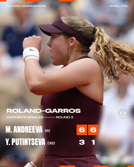 🔝 Мирра Андреева вышла в 1/8 финала «Ролан Гаррос» 18-летняя россиянка в четвёртом круге турнира Большого шлема обыграла представительницу Казахстана Юлию Путинцеву — 6:3, 6:1. Следующей соперницей шестой ракетки мира станет победительница матча Дарья Касаткина — Паула Бадоса. @russian_rt_sport
