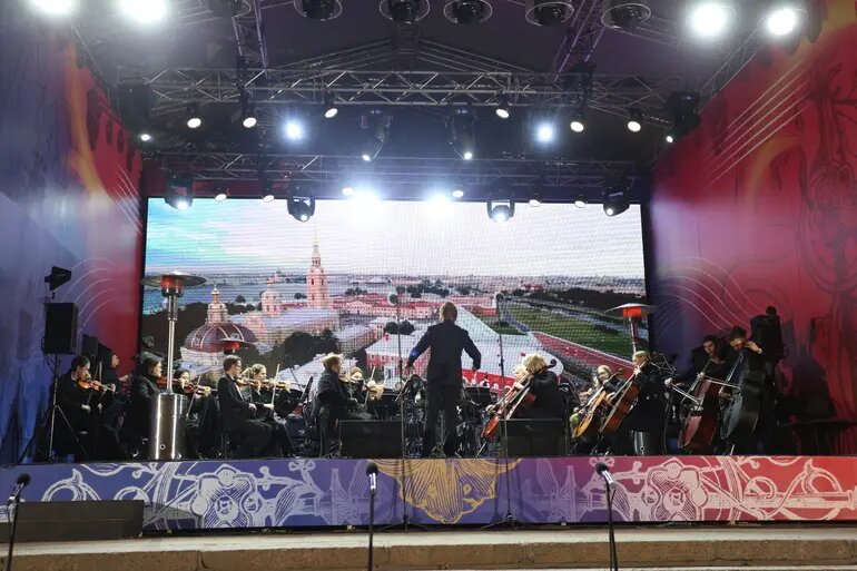 Фото: Baltphoto У жителей и гостей Санкт-Петербурга была возможность насладиться концертом артистов Театра имени Шаляпина, который прошел у Дворцового моста. Оркестр и солисты театра представили свою музыкальную программу «Музыка Дворцового моста». Им было важно успеть «зарифмовать» свое выступление с разведением Дворцового моста, которое происходит в полночь. Сцена на Дворцовой набережной, с видом на Дворцовый мост, уже не первый год собирает зрителей на концерты русской и советской музыки. В отличие от пышного убранства у Эрмитажа, здесь на экранах демонстрировались виды Петербурга. На открытой створке Дворцового моста были показаны сцены с видами города, а также работы видеохудожника на основе искусственного интеллекта. В этот день другие мосты не разводились, что позволяло зрителям беспрепятственно перемещаться между берегами. Концерт состоял из двух частей: в первой звучала оперная классика, а во второй — песенная музыка, и все произведения были на русском языке.
