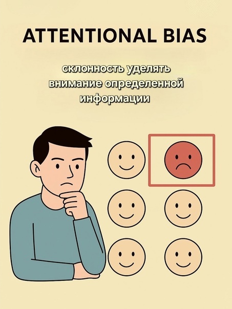 Это явление называется attentional bias — искажение внимания. Наш мозг словно автоматически «подсвечивает» определенные стимулы, чаще всего тревожные, негативные или угрожающие.