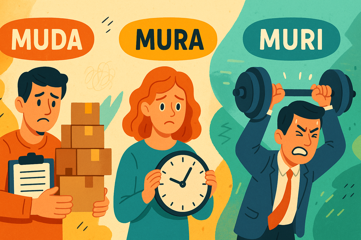 Вы можете внедрять Lean-инструменты, проводить тренинги и переставлять станки — но если в процессах остаются системные потери, результат будет слабым. В Lean-трансформации важно уметь видеть три типа потерь: Muda, Mura и Muri. Именно с них начинается настоящее улучшение. Самый известный тип потерь — Muda. Это всё, что не создаёт ценности для клиента: ожидание, лишние движения, избыточные запасы, переделки, ненужная транспортировка. Например, если товар лежит на складе месяцами — это Muda. Если сотрудник дважды вводит одни и те же данные — тоже Muda. Важно понимать: не вся деятельность, которая кажется нужной, действительно нужна. Если клиент не готов за это платить — это сигнал, что процесс можно упростить, сократить или автоматизировать. Mura означает неравномерность. Представьте, что заказы приходят «волнами»: то пусто, то слишком много. Или сотрудники загружены по-разному: один не успевает, другой сидит без дела. Такая нестабильность приводит к срывам сроков, переработкам и хаосу. У