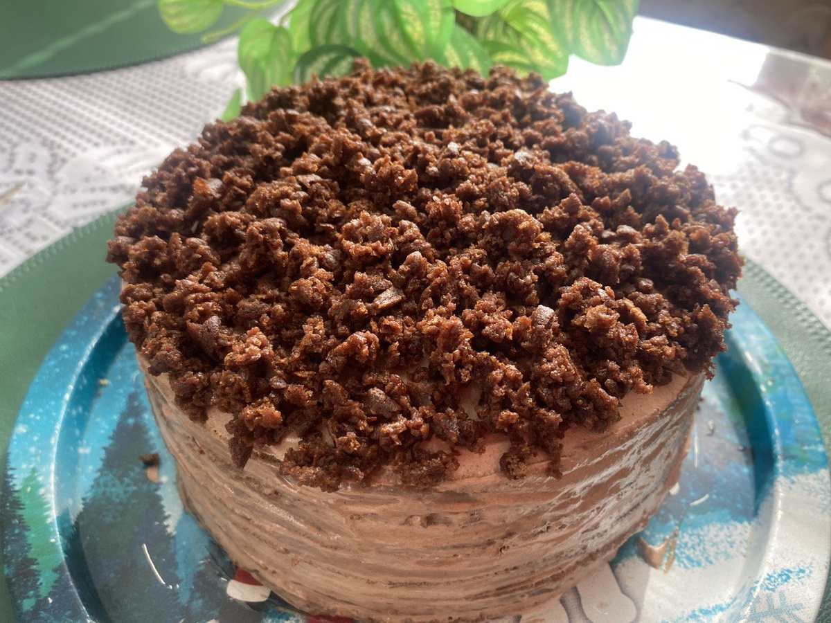- Обрезками измельченными украшаем верх торта, бока смазываем кремом.