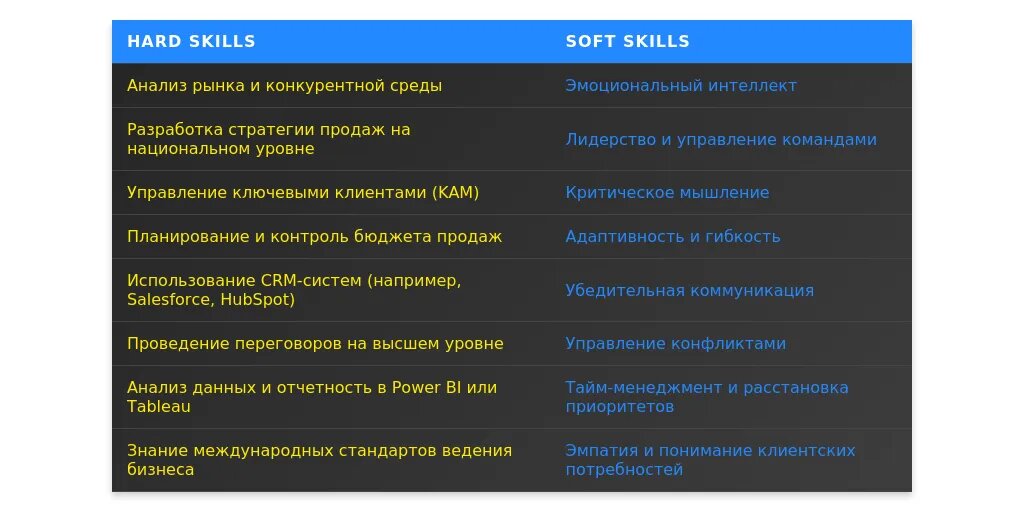 После адаптации: "Навыки стратегических продаж, управление командами до 20 человек, работа с CRM (Salesforce, HubSpot)."
