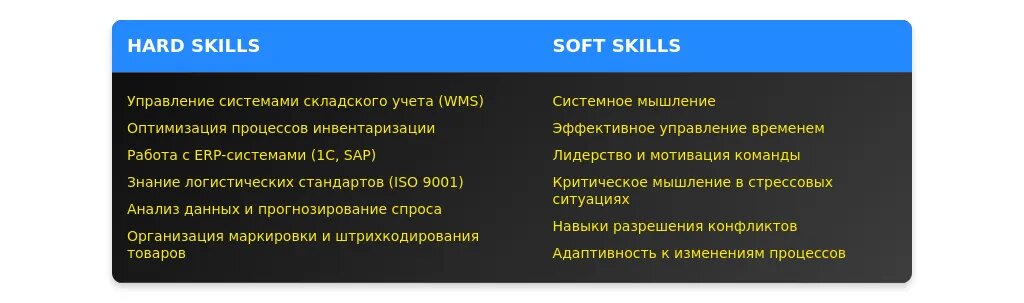- Указание устаревших навыков (например, ручной учет вместо WMS).