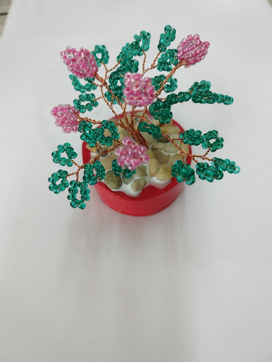 Самое простое плетение из бисера-это петельками. Справляются легко и 6-7 летние школьники. Сначала идёт простой набор на проволоку бисеринок ,так как розовый у меня мелкий , то я набираю по 10 штук и прокручиваю у основания петельки 4-5 раз удерживая за петельку. Зелёный покрупнее , поэтому набираю по 7-8 штук. Раздвигаю концы у проволоки и на один набираю опять 8 бусин. Снова прокручиваю у основания петельки 5 раз. Не забываем делать отступы 0,5 см. каждый раз , чтобы петельки не наползли друг на друга. Видите , от петельки до петельки идёт отступ, я его сразу и намечаю пальцем..Такой же отступ делается по стволу , то есть между рядами листьев. Скручиваю вместе цветок и лист. Если проволока тонкая , то дети каждую петельку на лист плетут отдельно на короткой проволоке , им так и легче , а потом эти 7 петелек на отдельных проволочках собираются в лист. Зачем так делать? Каркас листа получается прочнее. Но у меня проволока хорошая , толстоватая , поэтому лист плету на одной длинной, от
